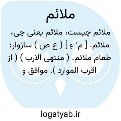 ( اسم ) ۱ - موافق مناسب: [... و انبساطی فزوده که خرد آنرا موافق مکاتبت نشمرد و ملایم مراسلت نداند... ] ( چهارمقاله ) ۲ - سازگار ۳ - آهسته آرام: [ باصدای ملایمی که لبانش را بزحمت بجنبش آورد گفت... ] ( سروته یک کرباس.ج ۴ ) ۱۵۶:۱ - نرم: [ چو میرود حرکاتش ملایم است چنان که وقت نازکی نغمه جنبش مضراب. ] ( وحشی بافقی. چا. امیر کبیر.۵ ) ۱۷۲ - شخص نرم خو آرام طبع مقابل آتشی مزاج تند خشن: [ مرد ملایمی است. ]