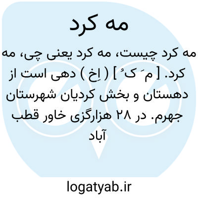 مه کرد. [ م َ ک ُ ] ( اِخ ) دهی است از دهستان و بخش کردیان شهرستان جهرم. در 28 هزارگزی خاور قطب آباد و 2هزارگزی راه فرعی فسا به قطب آباد. ( از فرهنگ جغرافیائی ایران ج 7 ). قریه ای است در شش فرسنگی میانه شمال و مشرق جهرم به فارس. ( فارسنامه ناصری ).