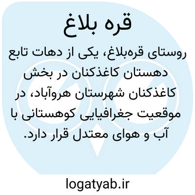 قره بلاغ. [ ق َ رَ ب ُ ] ( اِخ ) دهی جزء دهستان کاغذکنان بخش کاغذکنان شهرستان هروآباد واقع در 6 هزارگزی شمال آقکند و 19500 گزی شوسه میانه به زنجان. موقع جغرافیایی آن کوهستانی و هوای آن معتدل است. سکنه آن 851 تن. آب آن از سه رشته چشمه و محصولات آن غلات، حبوبات، سردرختی و شغل اهالی زراعت و گله داری است. صنایع دستی جاجیم بافی و گلیم بافی است. راه مالرو دارد. دبستان دارد. ( از فرهنگ جغرافیایی ایران ج 4 ).