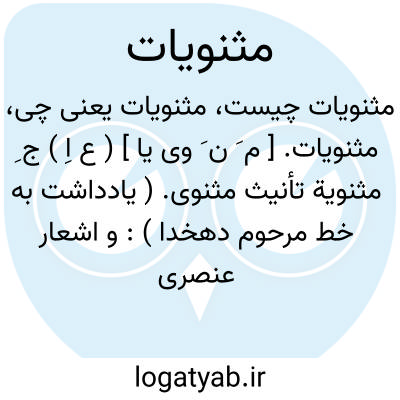 مثنویات. [ م َ ن َ وی یا ] ( ع اِ ) ج ِ مثنویة تأنیث مثنوی. ( یادداشت به خط مرحوم دهخدا ): و اشعار عنصری شعار فصاحت و دلیری دارد... و مثنویاتی که تألیف کرده است هم به اسم خزانه یمین الدوله چون شادبهر و عین الحیوة و وامق و عذرا و خنگ بت و سرخ بت هر یک گنج بدایع و خزانه حکم... است. ( لباب الالباب چ نفیسی ص 269 ). و رجوع به مثنوی شود.