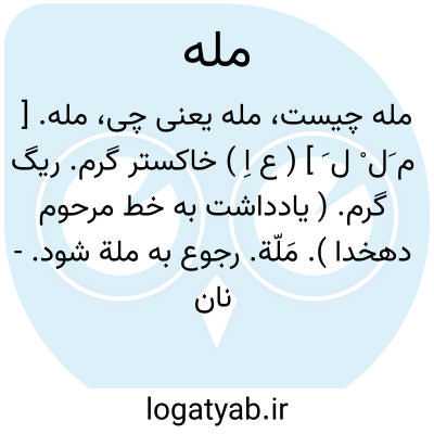 مله. [ م َل ْ ل َ ] ( ع اِ ) خاکستر گرم. ریگ گرم. ( یادداشت به خط مرحوم دهخدا ). مَلّة. رجوع به ملة شود.