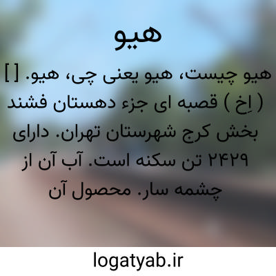 هیو. [ ] ( اِخ ) قصبه ای جزء دهستان فشند بخش کرج شهرستان تهران. دارای 2429 تن سکنه است. آب آن از چشمه سار. محصول آن غلات، بنشن، صیفی، باغات انگور، میوه جات، عسل، لبنیات و شغل اهالی زراعت و گله داری است و برخی در معدن ذغال سنگ کار می کنند. دبستان دارد. مزرعه سرای حشمت آباد واقع در کنار راه شوسه جزء این ده است. راه مالرو دارد و از قهوه خانه شاه دوست که سر راه شوسه واقعاست ماشین میرود. ( از فرهنگ جغرافیایی ایران ج 1 ).