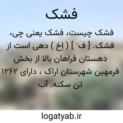 فشک. [ ف َ ] ( اِخ ) دهی است از دهستان فراهان بالا از بخش فرمهین شهرستان اراک، دارای 1262 تن سکنه. آب آن از قنات و رودخانه محلی و محصول عمده اش غله، بنشن و پنبه است. ( از فرهنگ جغرافیایی ایران ج 2 ).