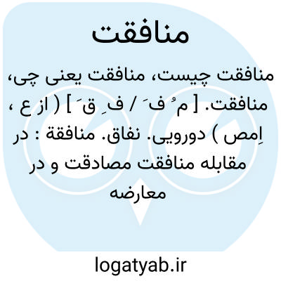 منافقت. [ م ُ ف َ / ف ِ ق َ ] ( از ع، اِمص ) دورویی. نفاق. منافقة: در مقابله منافقت مصادقت و در معارضه مخالفت موءالفت و در مواجهه مداهنت مهادنت نهد. ( منشآت خاقانی چ محمد روشن ص 233 ). رجوع به منافقة شود.