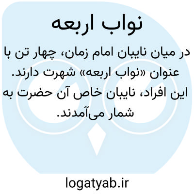 [ویکی شیعه] نُوّاب اَربَعه، به چهار نماینده یا نایب خاص امام مهدی (ع) در دوران غیبت صغری گفته می شود که رابط میان شیعیان و امام بودند: عثمان بن سعید، محمد بن عثمان، حسین بن روح و علی بن محمد سمری. نواب اربعه از اصحاب باسابقه و مورد اعتماد امامان بودند که یکی پس از دیگری از طرف امام زمان و با معرفی نایب پیش از خود معرفی می شدند. این چهار نفر به مدت هفتاد سال، نیابت امام را عهده دار بودند و با داشتن وکلایی در دورترین شهرهای اسلامی، پیام ها و خواسته های شیعیان را به امام و پاسخ های امام را به آنان می رساندند. از دیگر وظایف نایبان خاص این بود که تردیدها را درباره حضرت مهدی از بین ببرند و محل زندگی امام و مشخصات او را پنهان دارند.