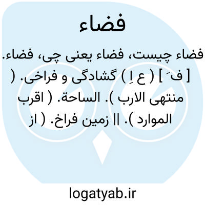 فضاء. [ ف َ ] ( ع اِ ) گشادگی و فراخی. ( منتهی الارب ). الساحة. ( اقرب الموارد ). || زمین فراخ. ( از منتهی الارب ). آنچه گشاده بود از زمین. ( اقرب الموارد ). || ( مص ) فراخ شدن جای. ( منتهی الارب ) ( از اقرب الموارد ). || در کیسه کردن درهمها را. ( منتهی الارب ).