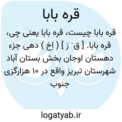 قره بابا. [ ق َ رَ ] ( اِخ ) دهی جزء دهستان اوجان بخش بستان آباد شهرستان تبریز واقع در 10 هزارگزی جنوب بستان آباد و 3 هزارگزی شوسه میانه به تبریز. موقع جغرافیایی آن جلگه سردسیر است. سکنه آن 1271 تن. آب آن از رودخانه چناق بلاغ و چشمه است. محصولات آن غلات و شغل اهالی زراعت و گله داری است. راه مالرو دارد. ( از فرهنگ جغرافیایی ایران ج 4 ).