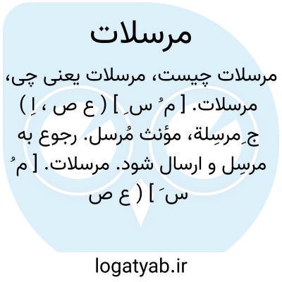 مرسلات. [ م ُ س َ ] ( اِخ ) ( الَ... ) نام سوره 77 از قرآن کریم، مکیه است و پنجاه آیت دارد و پس از سوره قیامت و پیش از نباء قرار گرفته و با آیه «والمرسلات عرفا» آغاز میگردد.