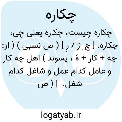 چکاره. [ چ ِ رَ / رِ ] ( ص نسبی ) ( از: چه + کار + هَ، پسوند ) اهل چه کار و عامل کدام عمل و شاغل کدام شغل. || ( ص مرکب ) نابکار. ( ناظم الاطباء ). رجوع به چکاری شود. || باطل و بیفایده. ( ناظم الاطباء ). رجوع به چکاری شود. || در تداول عامه،کنایه از کسی که بی علت و سبب و بدون جهت در امری و کاری مداخله کند، چنانکه گویند: فلان کس چکاره است ؟