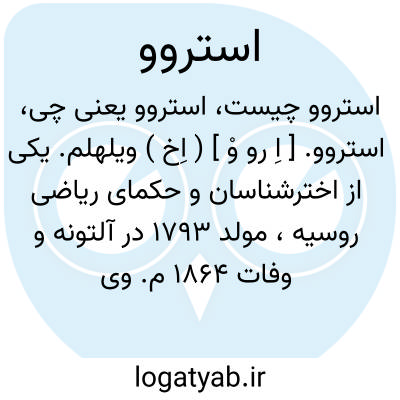 استروو. [ اِ رو وْ ] ( اِخ ) ویلهلم. یکی از اخترشناسان و حکمای ریاضی روسیه، مولد 1793 در آلتونه و وفات 1864 م. وی رئیس هیأتی از دانشمندان بود که تنظیم نقشه مکمّل روسیه را بعهده داشتند. او چند رصدخانه در این کشور تأسیس و تحقیقات بسیار در هیأت و جغرافیا منتشر کرده است.