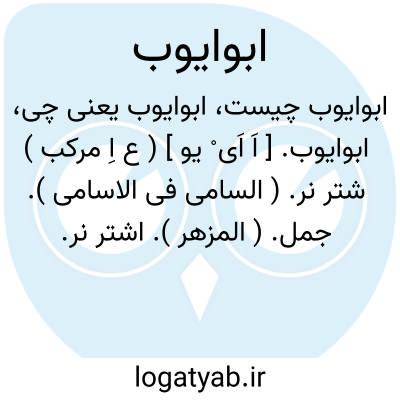 ابوایوب. [ اَ اَی ْ یو ] ( ع اِ مرکب ) شتر نر. ( السامی فی الاسامی ). جمل. ( المزهر ). اشتر نر. ابوصفوان. ( السامی فی الاسامی ). اشتر. ( مهذب الاسماء ). || صاحب مؤید الفضلا دو معنی دیگر بدین کلمه داده است یکی سبزه و دیگری تری باران که در شب بارد. لیکن این دو معنی را در جای دیگر نیافتم.