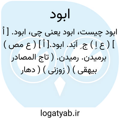 ابود.[ اُ ] ( ع مص ) برمیدن. رمیدن. ( تاج المصادر بیهقی ) ( زوزنی ) ( دهار ). وحشی شدن. ( زوزنی ). وحشت گرفتن، چنانکه بهیمه. || مقیم شدن بجای. ( دهار ) ( تاج المصادر بیهقی ). بجائی مقیم شدن. ( زوزنی ). ایستادن. استادن. اقامت کردن. || گفتن شعری مشکل که معنی آن دانسته نمیشود. || جاودانه شدن.