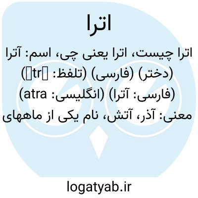 معنی: آذر، آتش، نام یکی از ماههای پاییز، آتشین، آذرین، ( به مجاز ) سرخ رو و زیبا، ( اَعلام ) ( در میتولوژی یونان ) آترا دختر پیته، Pithe نواده ی پله ویس، Pelevis و مادر تزه است، بیشتر شهرت آترا از موجودیت شگفت انگیز تزه و قهرمانی های او سرچشمه می گیرد که سوژه ی بسیاری از فیلم ها و داستان ها نیز شده است چنان که گفته اند آترا پس از سقوط تزه از کوه که به مرگ او انجامید از فشار اندوه و ناراحتی درگذشت