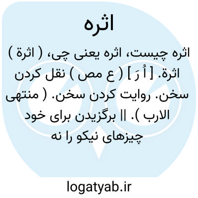 اثره. [ اَ ث َ رَ ] ( ع اِ ) اُثْرَه. اَثاره. بقیه چیز. || برگزیده. || بقیه ای از علم که برگزیده و نقل کرده شود از سلف. || بقیه پیه.