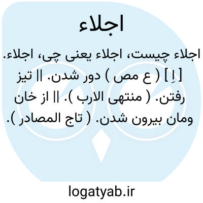 اجلاء. [ اِ ] ( ع مص ) دور شدن. || تیز رفتن. ( منتهی الارب ). || از خان ومان بیرون شدن. ( تاج المصادر ). از خانمان رفتن، یا مختص بقحط است. ( منتهی الارب ). || از خان ومان بیرون کردن. ( تاج المصادر ). نفی کردن. حشر وتبعید کردن. || باز شدن از سر کشته ( ؟ ). ( تاج المصادر ). || پیدا کردن. ظاهر کردن.