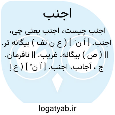 اجنب. [ اَ ن َ ] ( ع ن تف ) بیگانه تر. || ( ص ) بیگانه. غریب. || نافرمان. ج، اَجانب.