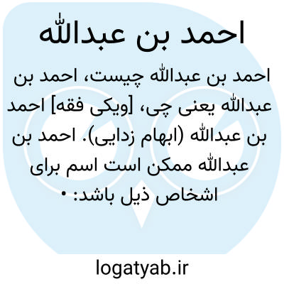 [ویکی فقه] احمد بن عبدالله (ابهام زدایی). احمد بن عبدالله ممکن است اسم برای اشخاص ذیل باشد: • احمد بن عبدالله بکری، بَکری، ابوالحسن احمد بن عبدالله، مؤلف و فقیه امامی• احمد بن عبدالله خجستانی، از امرای دوره طاهریان و صفاریان بوده و اهل خجستان، از توابع بادغیس• محب الدین طبری، از علمای شافعی و شیخ شافعیان در حجاز و سرآمد در علم فقه و حدیث• احمد بن عبدالله قلقشندی، صاحب آثاری همچون صبح الاعشی، نهایة الارب فی معرفة انساب العرب• احمد بن عبدالله کرمانی، کرمانی، حمید الدین، احمد بن عبدالله ابوالحسن، سخنگوی بزرگ فلسفه اسماعیلیه در دورۀ خلافت فاطمیِ الحاکم بأمرالله