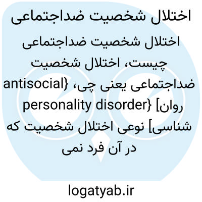 {antisocial personality disorder} [روان شناسی] نوعی اختلال شخصیت که در آن فرد نمی تواند با موازین اجتماعی سازگار شود و در قبال رفتارهایش احساس گناه و اضطراب ندارد