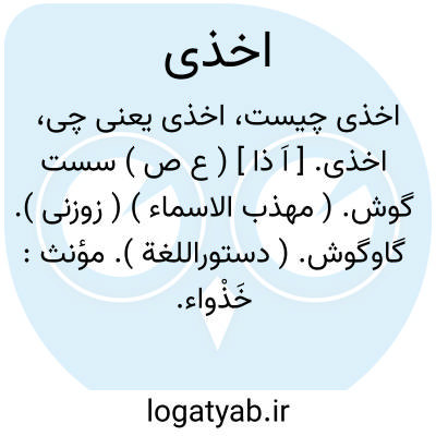 اخذی. [ اَ ذا ] ( ع ص ) سست گوش. ( مهذب الاسماء ) ( زوزنی ). گاوگوش. ( دستوراللغة ). مؤنث: خَذْواء.