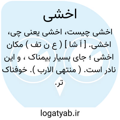 اخشی. [ اَ شا ] ( ع ن تف ) مکان اخشی؛ جای بسیار بیمناک، و این نادر است. ( منتهی الارب ). خوفناک تر. ترسناک تر. هذا المکان ُ اَخْشی ̍؛ ای اَخْوَف ُ، نادر. ( قاموس ).