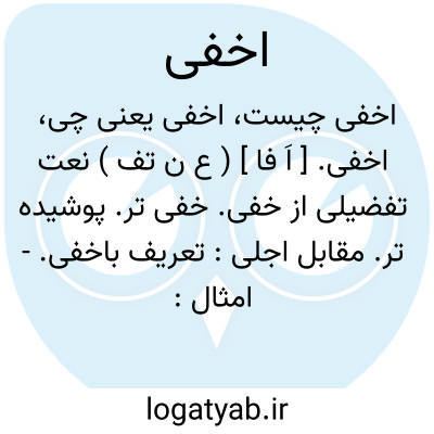 اخفی. [ اَ فا ] ( ع ن تف ) نعت تفضیلی از خفی. خفی تر. پوشیده تر. مقابل اجلی: تعریف باخفی.