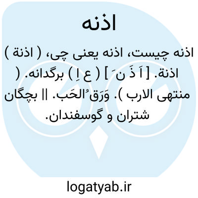 ( اذنة ) اذنة. [ اَ ذَ ن َ ] ( ع اِ ) برگدانه. ( منتهی الارب ). وَرَق ُالحَب. || بچگان شتران و گوسفندان. || طعام لااَذَنَةَ لها؛ طعامی که رغبت بدان نباشد. || گیاه خشک. ج، اُذَن.