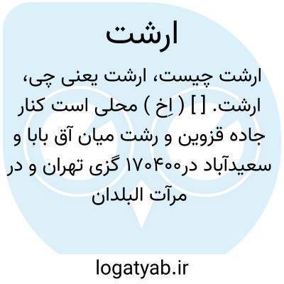 ارشت. [ ] ( اِخ ) محلی است کنار جاده قزوین و رشت میان آق بابا و سعیدآباد در170400 گزی تهران و در مرآت البلدان آمده: ارشت و تاشفین دو مزرعه است حاصلخیز از اعمال قزوین و مسافت این دو تا قزوین سه فرسخ است. از عجایب ارشت و تاشفین این است که در ارشت آهن صلاحیت دارد که از او آلات و ادوات بسازند بعکس تاشفین و در تاشفین خمره صباغی خیلی خوب و بعکس در ارشت که صلاحیت این کار را پیدا نمیکند و در تاشفین آهنگر نیست چنانکه در ارشت نیز صباغ نیست و این معروف است و مردم همه جا اطلاع دارند.
