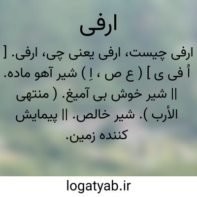 ارفی. [ اُ فی ی ] ( ع ص، اِ ) شیر آهو ماده. || شیر خوش بی آمیغ. ( منتهی الأرب ). شیر خالص. || پیمایش کننده زمین. ( منتهی الأرب ). ماسح. مسّاح.