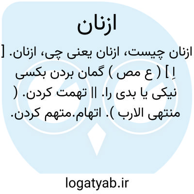 ازنان. [ اِ ] ( ع مص ) گمان بردن بکسی نیکی یا بدی را. || تهمت کردن. ( منتهی الارب ). اتهام.متهم کردن. ( تاج المصادر بیهقی ). متهم گردانیدن. ( زوزنی ). تهمت زدن. تهمت افکندن. اتهام. زَن. زنون.