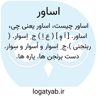 اساور. [ اَ وِ ] ( ع اِ ) ج ِ اِسوار. ( ربنجنی ).ج ِ اِسوار و اُسوار و سِوار. دست برنجن ها. یاره ها.