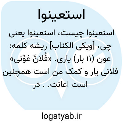 یاری. «فُلانٌ عَوْنی» فلانی یار و کمک من است همچنین است اعانت.. در آوردن قرآن گروه دیگری او را یاری کرده‏اند. بر خوبی و تقوی یکدیگر را یاری نمائید و بر گناه و تجاوز همدیگر را یاری نکنید. استعانت: یاری خواستن... از صبر و صلوة در انجام اوامر خدا کمک جوئید. مستعان: اسم مفعول است، یاری جسته شده.