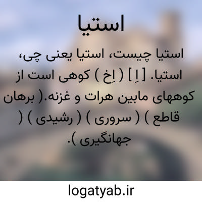 استیا. [ اِ ] ( اِخ ) کوهی است از کوههای مابین هرات و غزنه.( برهان قاطع ) ( سروری ) ( رشیدی ) ( جهانگیری ). مشهورترین شهر غور، بین جبال هرات و غزنه. ( معجم البلدان ).