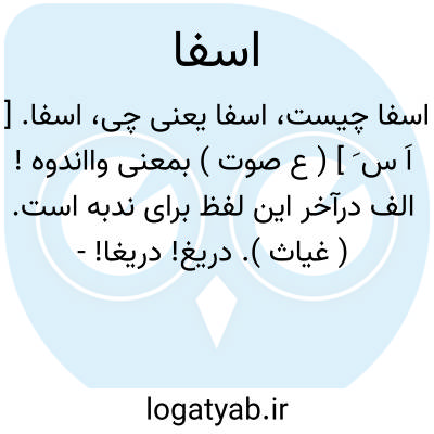 اسفا. [ اَ س َ ] ( ع صوت ) بمعنی وااندوه ! الف درآخر این لفظ برای ندبه است. ( غیاث ). دریغ! دریغا!