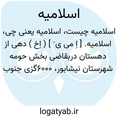 اسلامیه. [ اِ می ی َ ] ( اِخ ) دهی از دهستان دربقاضی بخش حومه شهرستان نیشابور، 6000گزی جنوب خاور نیشابور، جلگه، معتدل، سکنه 35 تن. شیعه. زبان فارسی. آب آن از قنات. محصول آن غلات، تریاک، میوه جات. شغل اهالی زراعت، مالداری و قالیچه بافی.راه فرعی شوسه دارد. ( فرهنگ جغرافیایی ایران ج 9 ).