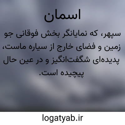 ( آسمان ) آسمان. [ س ْ / س ِ ] ( اِ ) چرخ. سماء. سما. فلک. اثیر. ام النجوم. سپهر. گنبد. گردون. گرزمان. خضراء. خضرا. میناء. عجوز. جرباء. رقیع. ضاحیه. جربةالنجوم. و آن بعقیده قدماء هفت باشد. مقابل زمین: