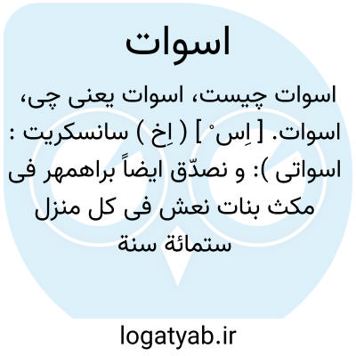 اسوات. [ اِس ْ ] ( اِخ ) سانسکریت: اسواتی ): و نصدّق ایضاً براهمهر فی مکث بنات نعش فی کل منزل ستمائة سنة فیکون موضعه لسنتنا فی المیزان ست درجات و سبععشرة دقیقة، و ذلک فی منزل اسوات عشر درج و ثمان و ثلثین دقیقة. ( تحقیق ماللهند بیرونی ص 196 ).