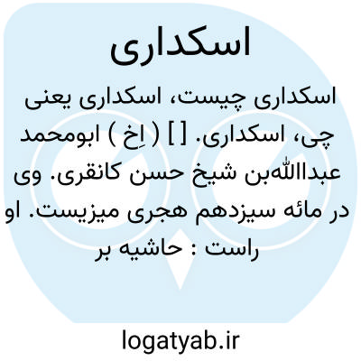 اسکداری. [ ] ( اِخ ) ابومحمد عبداﷲبن شیخ حسن کانقری. وی در مائه سیزدهم هجری میزیست. او راست: حاشیه بر حاشیه خیالی بر شرح سعد بر عقاید نسفیه ( توحید )، و در بولاق بسال 1254 هَ. ق. بطبع رسیده است. ( معجم المطبوعات ).