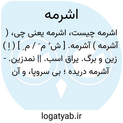 ( آشرمه ) ( اسم ) ۱ - نمد زین اسب و مانند آن تکلتو. ۲ - زینی که نمد زین آن دو نیم بود. ۳ - درفشکه بدان نمد زین دوزند. ۴ - سلاح مانند خنجر و شمشیر و تیر و کمان