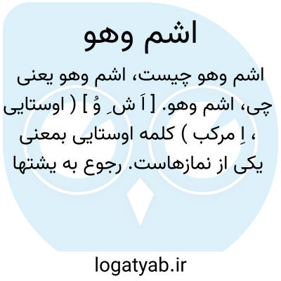 اشم وهو. [ اَ ش ِ وُ ] ( اوستایی، اِ مرکب ) کلمه اوستایی بمعنی یکی از نمازهاست. رجوع به یشتها ص 32، 136 و 604 شود.