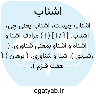 آشنابه آب، آب آشنا، شناکننده، شناگر، آنکه بتوانددر آب شناکند، آشناب: شنا، شناوری، آبورزی، به معنی شناکننده و آنکه ( اسم ) شنا شناوری آب ورزی.