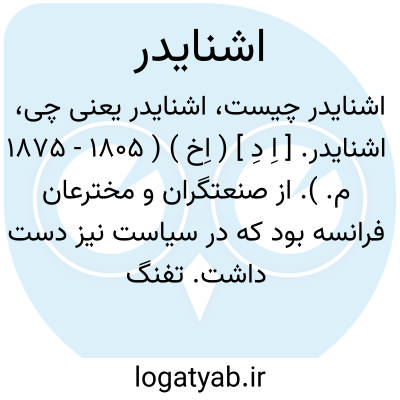 اشنایدر. [ اِ دِ ] ( اِخ ) ( 1805 - 1875 م. ). از صنعتگران و مخترعان فرانسه بود که در سیاست نیز دست داشت. تفنگ معروفی بهمین نام از اختراعات اوست. در قصبه بیدسترف در خانواده ای اشرافی تولد یافت و نخست در بانک کار میکرد، آنگاه ( 1836 ) بمدیریت کارخانه آهن کروزت برگزیده شد و در آن اصلاحات مهمی بعمل آورد و کارخانه رااز اضمحلال نجات بخشید و در راه رفاه کارگران کارخانه که به 15 هزار تن رسیده بودند منتهای عنایت مبذول داشت و موجبات تربیت فرزندان کارگران را فراهم آورد.سپس در سال 1845 دولت فرانسه او را به مستشاری ایالت سائون بالوآر برگزید و پس از چندی مردم آن ناحیه او را بنمایندگی پارلمان انتخاب کردند. پس از انقلاب 1848 از کارهای دولتی دوری گزید لیکن در سال 1851 ناپلئون سوم او را به وزارت بازرگانی و کشاورزی برگزید و در سال 1867 بریاست پارلمان برگزیده شد. پس از سقوط ناپلئون بار دیگر به کارخانه بازگشت و در تکمیل و اصلاح سلاحهای گرم ابتکارات بسیاری از خود نشان داد.