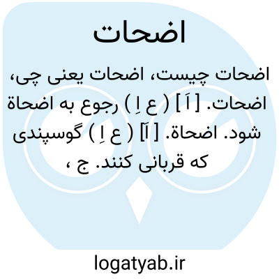 اضحاة. [ اَ] ( ع اِ ) گوسپندی که قربانی کنند. ج، اَضْحی ̍. مؤنث است. و هرگاه مذکر آورده شود مراد روز است. ( از اقرب الموارد ). آن قربانی که هر جا کنند. ج، اضحی، اضاحی. ( مهذب الاسماء ). بمعنی اُضْحیّة، گوسپند که در چاشت یا در روز اضحی ذبح کنند. ج، اضحی. ( منتهی الارب ) ( ناظم الاطباء ). || روز اضحی یا روز نحر. ( از اقرب الموارد ). روز عید قربان. روز گوسپندکشان.