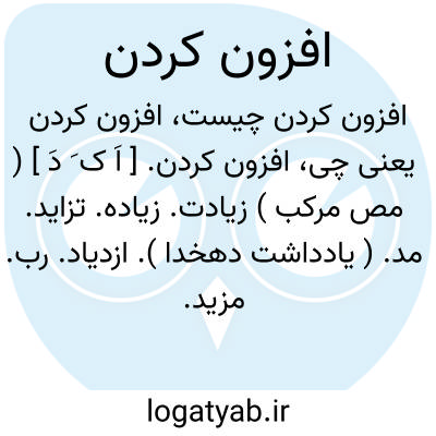 افزون کردن. [ اَ ک َ دَ ] ( مص مرکب ) زیادت. زیاده. تزاید. مد. ( یادداشت دهخدا ). ازدیاد. رب. مزید. مزاده. مضاعفه. تضعیف. اضعاف. ( تاج المصادربیهقی ). مزز. ( منتهی الارب ). زید. زیادی. تضعیف. ( دهار ). و رجوع به افزون و ترکیبات آن شود: