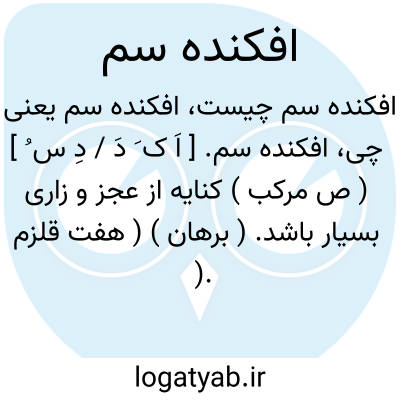 افکنده سم. [ اَ ک َ دَ / دِ س ُ ] ( ص مرکب ) کنایه از عجز و زاری بسیار باشد. ( برهان ) ( هفت قلزم ). عاجزگشته. زارگشته. ( ناظم الاطباء ):