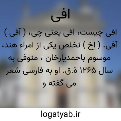 ( آفی ) آفی. ( اِخ ) تخلص یکی از امراء هند، موسوم باحمدیارخان، متوفی به سال 1265 هَ.ق. او به فارسی شعر می گفته و مثنویی به نام گلزار خیال دارد.