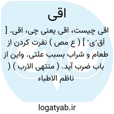 اقی. [ اَق ْی ْ ] ( ع مص ) نفرت کردن از طعام و شراب بسبب علتی. واین از باب ضرب آید. ( منتهی الارب ) ( ناظم الاطباء ).