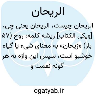 ،. در تمام قرآن مجید این کلمه فقط دو بار آمده است. ریحان را بوئیدنی. و ر.زی گفته‏اند راغب گوید: ریحان چیزی است که رائحه داشته باشد و گفته‏اند: رزق است. در اقرب چند معنی نقل شده که از جمله بوئیدنی و رزق است و همچنین است در مجمع: ابن اثیر در نهایه گوید: ریحان برحمت و رزق و راحت اطلاق‏می شود و ریحان هر گیاهی است که بوی خوش داشته باشد و در اثر اطلاق برزق به فرزند ریحان گفته شده و از آن است حدیث رسول خدا صلی اللّه علیه و آله و سلم که به علی علیه السلام فرموده «اَوْصیکَ بِریحانَتیّی خَیْراً فی الدُّنیا...» مرادش حسنین علیهمالسلام بود. به نظر می‏آید معنای اصلی آن بوئدنی است و در رزق و رحمت با عنایت استعمال می‏شود و آن در آیه اول بوئیدنی و در آیه دوم روزی است.
