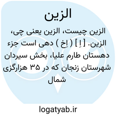 الزین. [ اِ ] ( اِخ ) دهی است جزء دهستان طارم علیا، بخش سیردان شهرستان زنجان که در 35 هزارگزی شمال باختری سیردان و ده هزارگزی راه مالرو طارم قرار دارد. کوهستانی و معتدل است. سکنه آن 228 تن شیعه ترکی زبانند. آب آن از رودخانه سرخ دیزج تأمین شود و محصول آن پنبه، انار و گردو، و شغل اهالی زراعت و گلیم و جاجیم بافی است. راه مالرو وصعب العبور دارد. ( از فرهنگ جغرافیایی ایران ج 2 ).