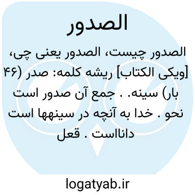 سینه.. جمع آن صدور است نحو. خدا به آنچه در سینه‏ها است دانااست. قعل صدر چون با «عن» متعدی شود معنای رجوع می‏دهد «صَدَرَ عَنِ الْمَکانِ» یعنی از مکان برگشن. و چون با «من» متعدی شود به معنی بروز و ظهور باشد «صَدَرَ مِنْهُ الْاَمْرُ» یعنی این کار از او بروز کرد. ایضاً به معنی حدوث و حصول آید «صَدَرَ الْاَمْرُ صُدُوراً» یعنی کار حادث شد. و نیز صدر به معنی رجوع و ارجاع (لازم متعدی) آمده است (اقرب).. «یصدر» در قرآن‏ها به ضم (ی) و کسر (د) نوشته شده ولی به فتح (ی) و ضمّ (د) از باب نصر ینصر نی خوانده‏اند. بنابر اول معنای آن چنین است: گفتند ما گوسفندان خود را آب نمی‏دهیم تا چوپان‏ها مواشی خود را از آب بر گردانند. پدر ما پیری بزرگ است. و بنابر دوم این است... تا چوپان‏ها از آب بر گردند.. ممکن است «یصدر» به معنی حدوث باشد یعنی آن روز مردم به طور پراکنده و متفرق حادث و ظاهر می‏شود. شاید به معنی بروز باشد یعنی «یَصْدُرُ النّاسُ مِنَ الْاَرْضِ اَشْتاتاً» چنانکه در آیه دیگر آمده. و نیز آمده. در «شتت» گفتیم: ظاهراً مراد از اشتات متفرق و بی نظم بودن است چنانکه فرموده. حدوث. بروز نزدیک به هم اند. آیاتی هست درباره سعه صدر تنگی آن و اینکه خدا شرح صدر عطا می‏کند و سینه را تنگ می‏گرداند. نظیر. ایضاً. و مثل. مراد از صدر در این آیات چیست؟ آیا سینه است یا قلب و به اعتبار حال و محل قلب را صدر خوانده است؟ به نظر می‏آید: منظور سعه و ضیق قلب است و به اعتبارآن که قلب در سینهاست صدر گفته شده و اینکه بعضی‏ها قلب را به معنی نفس گرفته‏اند به دلیل اینکه درک و فهم و غیره مال نفس است نه قلب در «قلب» شرح داده خواهد شد. در بعضی آیات افعالی نسبت داده شده نظیر،،. از این قبیل است آیاتیکه درباره شفای صدور، کینه صدور، محتویات صدور، وسوسه صدور اند مثل،،، به نظر من مراد از همه آنها قلوب است و به اعتبار حال و محل صدور به کار رفته است واللّه اعلم.