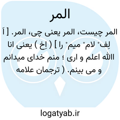 المر. [ اَ لِف ْ لام ْ میم ْ را ] ( اِخ ) یعنی انا اﷲ اعلم و اری؛ منم خدای میدانم و می بینم. ( ترجمان علامه تهذیب عادل ). معنای آن: انا المحیی الممیت الرزاق. ( ناظم الاطباء ). از فواتح سور و حروف مقطعه قرآن کریم است و سوره رعد بدان آغاز میشود. رجوع به کشف الاسرارج 5 ص 154 و 156 و ماده «الم » و «فواتح سور» شود.